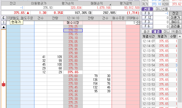 오늘의 진폭 윗선이 375.60 이라고 했다. 요길 양봉 세우고 뚫고 올라갔다. 처음 올라갈땐 매수 따라잡지 않았다.