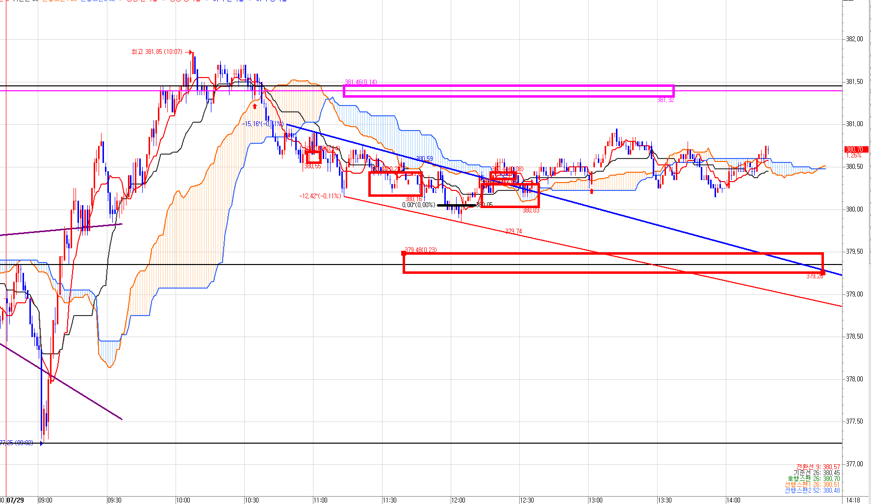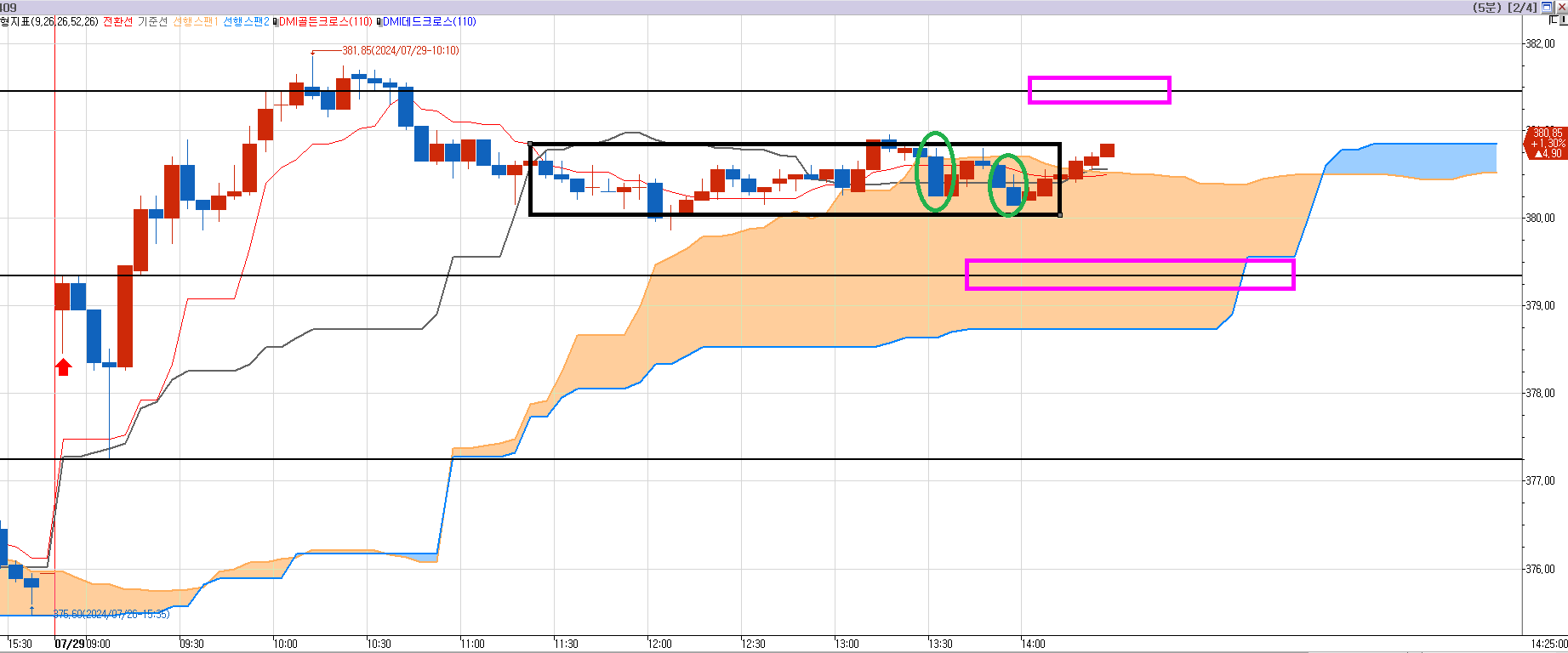 빨간 박스를 매수 진입했다. 분홍박스 381.40 매수목표가를 노리면서~