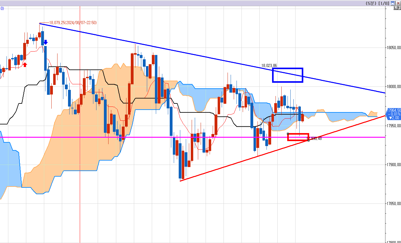 8월8일 오늘 나스닥 5분봉이다.