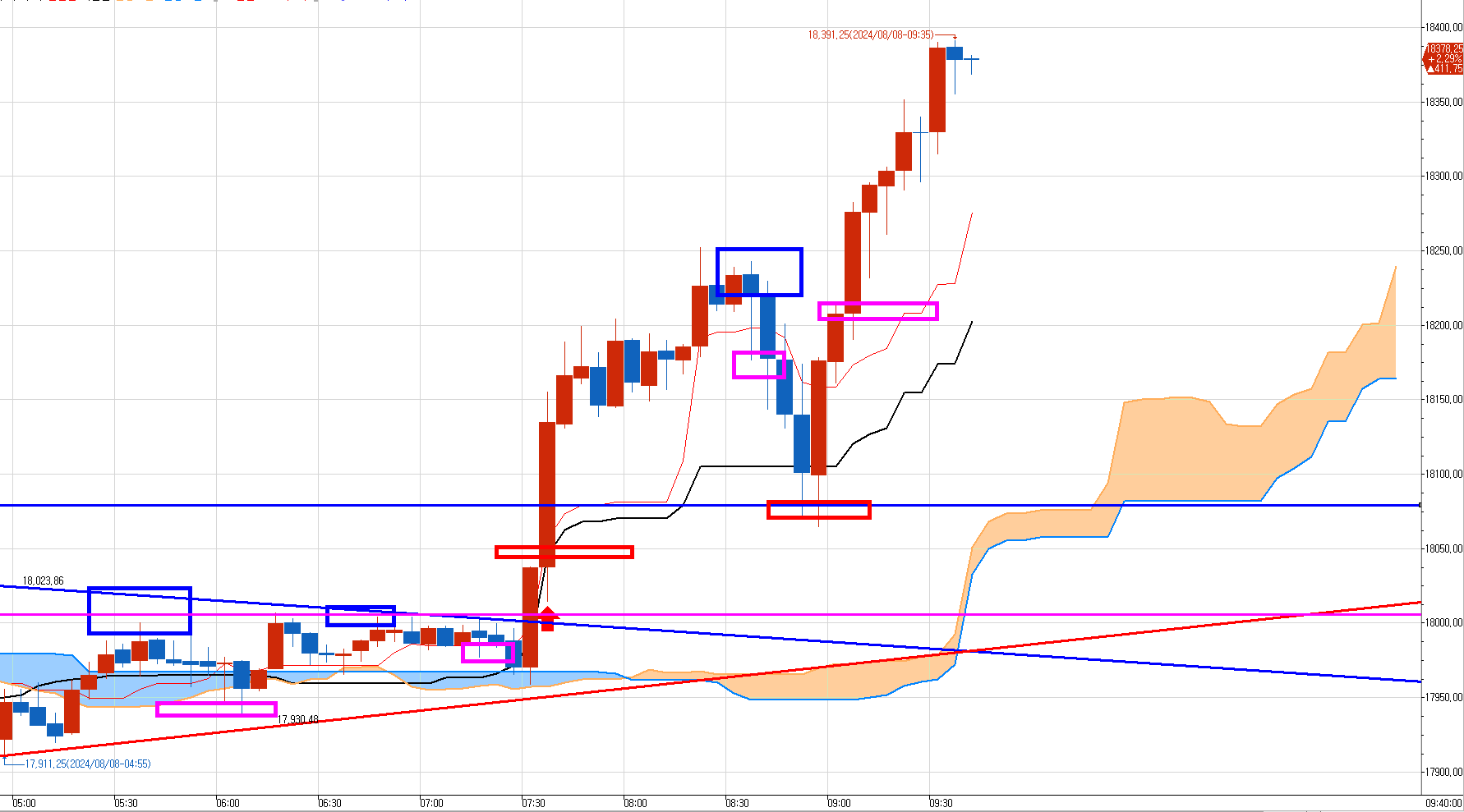 손절치고 은행 갔다 돌아오니... 짬밥으로 예상했던 밑의 분홍색 목표가 들을 다 쳐버렸다.