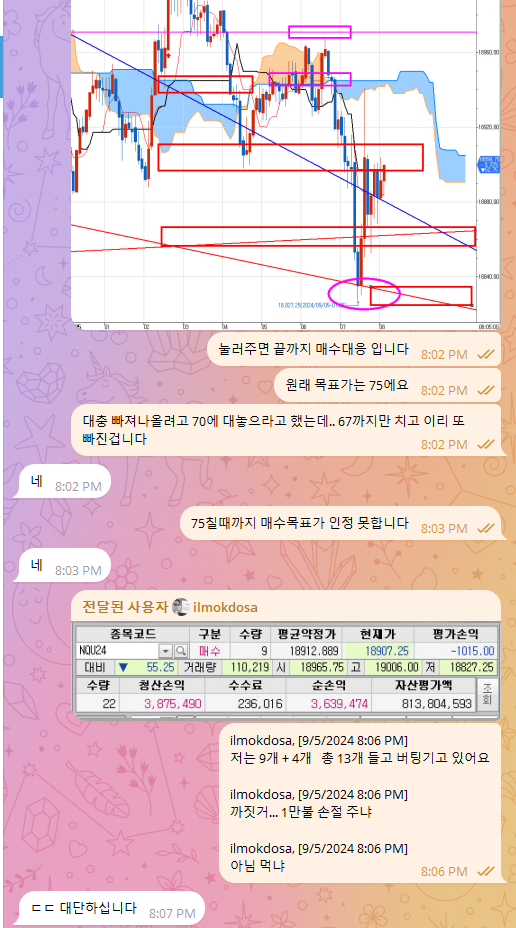 1개 최종매수목표가 윗 긴 분홍박스 18975보다 20틱이나 낮춰서 18970에 청산 걸어 놓았다.