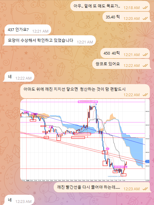 2. 늦은 새벽시간 집중도 잘 안되고 막걸리 3잔 마시면서 음주매매 하고 있어서 저점에서 쳐 올릴때 발생한 매도 목표가를 보지 못했다가 순간 매도 목표가를 찾아낸 것이다. 아래 분홍박스가 매도목표가 였다.