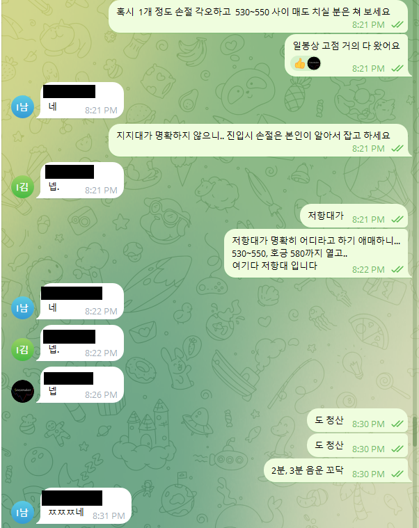 "530에서 580까지 열어두고 좀 물려도 괜찮다는 생각이면 1개 정도 매도 들어가 보세용"