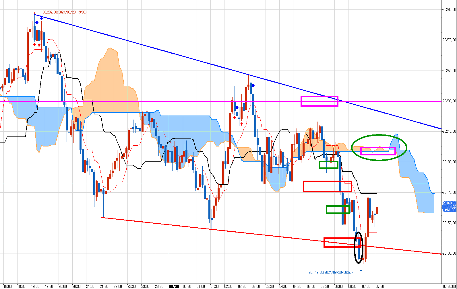 어제 미장 시작전에 일목중생들께 미리 보낸 5분봉 차트다.