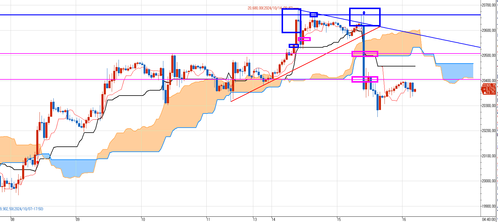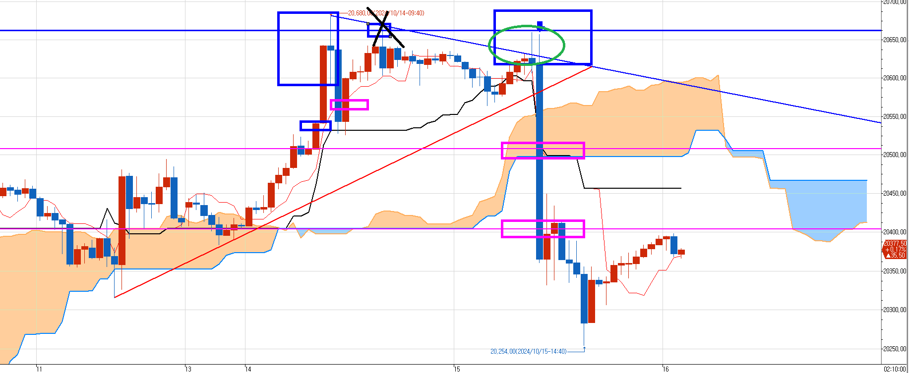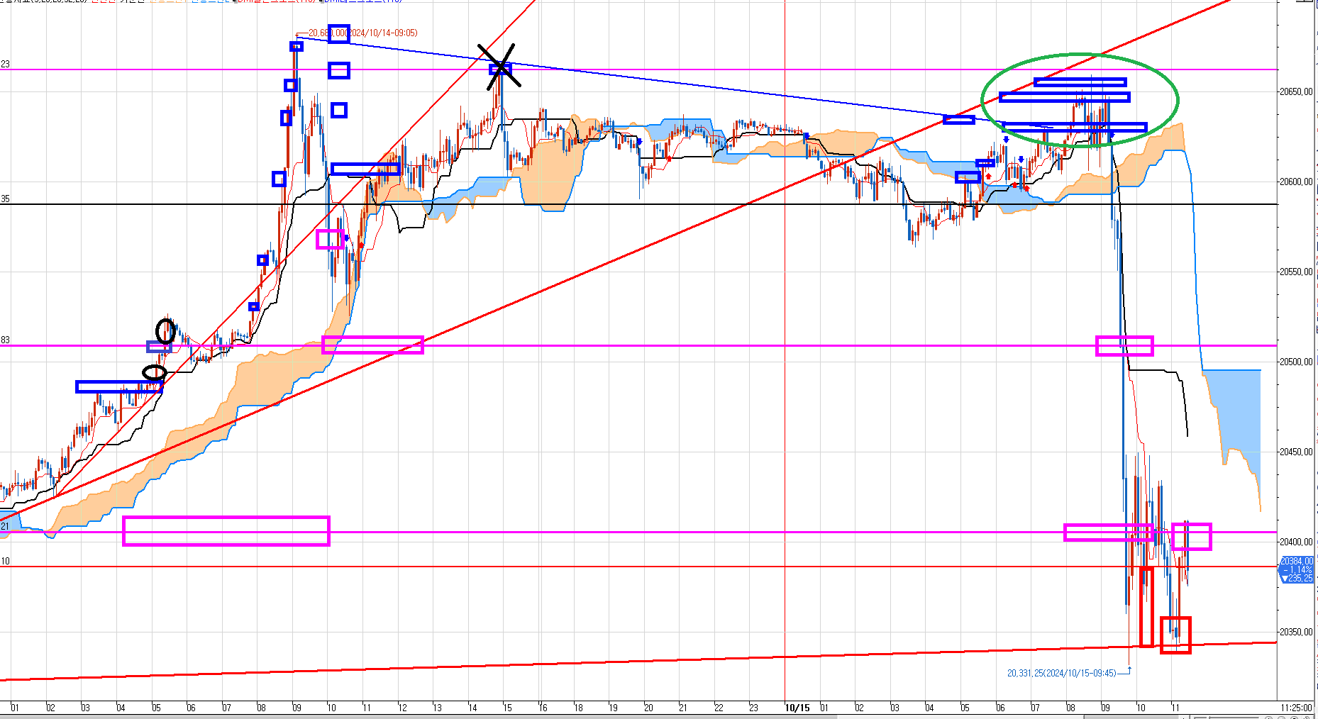 14일 월요일 야간에 왼쪽 두개 박스 구간에 분할로 매도 진입하여 일단 아래 분홍박스 분할 익절하고 나머지 홀딩하고 잤다. 최종 매도목표가는 아래 두개 긴 분홍색선 20508과 20407 이었다.