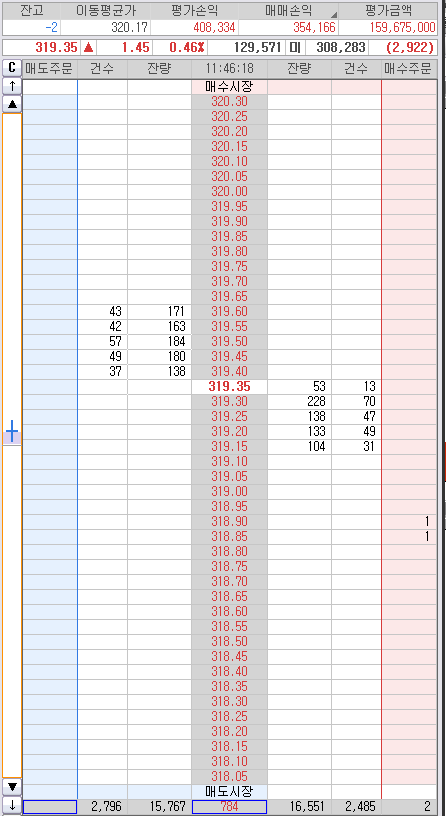 파란색 매도 구간에서 매도 진입하여 이미 알고 있는 오늘의 매도 목표가 318.90~318.65 에 마지막 2개 남은것 수익청산했다.