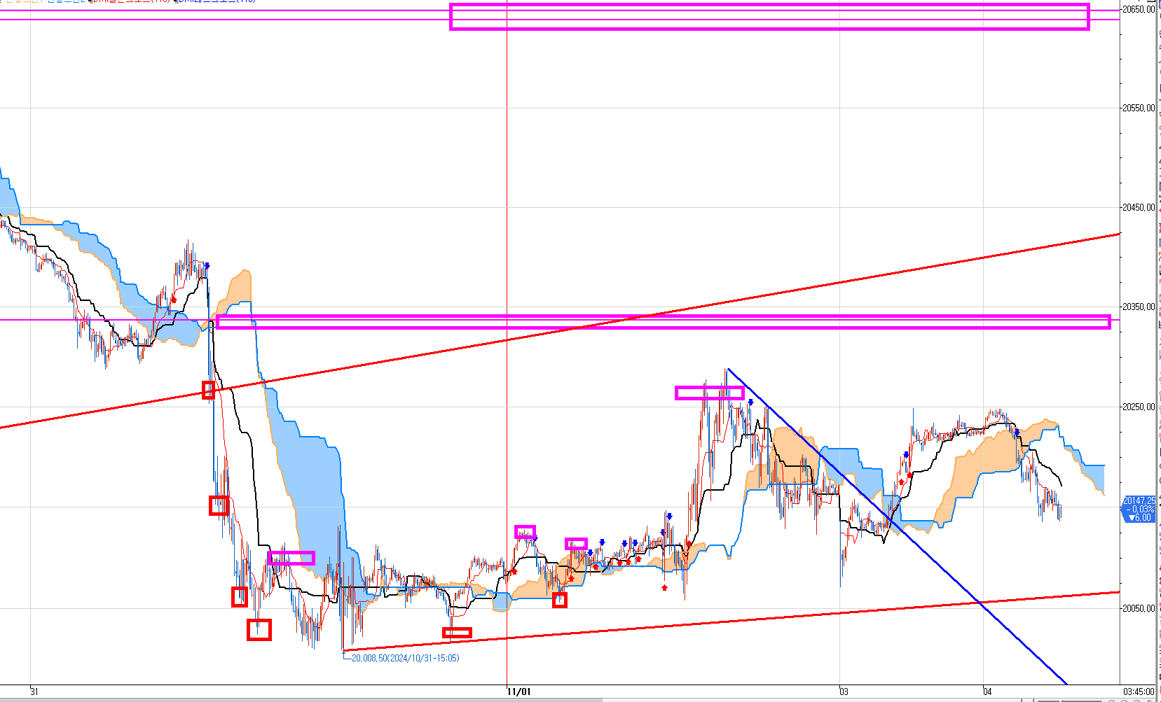 10월25일 지지난주 금요일 부터 매도 진입했다. 왼쪽 파란 박스들이 모두 매도 들이댔던 구간이다.
