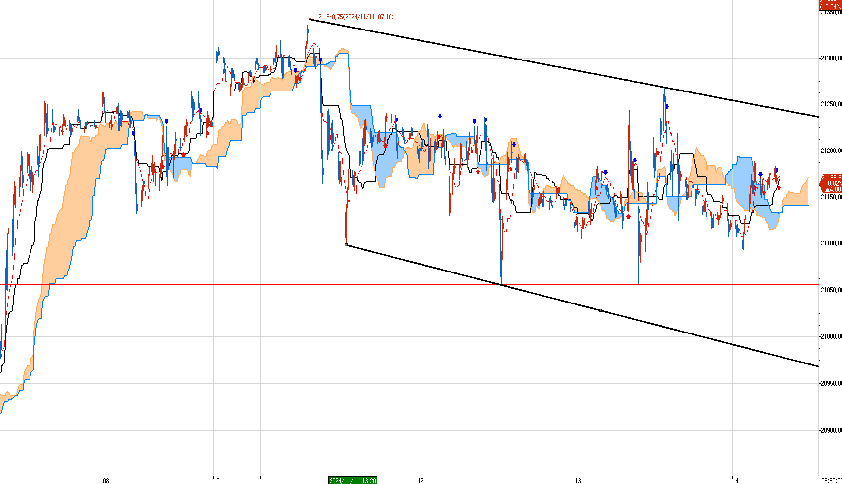 과거 저항선 이었던 파란선이 미 대선 결과 후 장대 양봉으로 뚤려 버리면서 지금 그 자리가 지지로 바뀌어 있다.