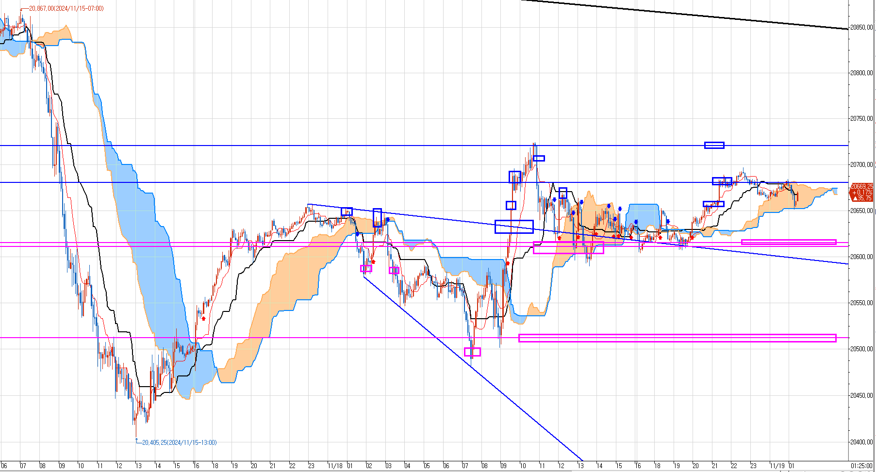 우리는 20620 위에서 매도 대기하고 있다가 위의 파란박스 5구간에서 분할 매도 진입했다.