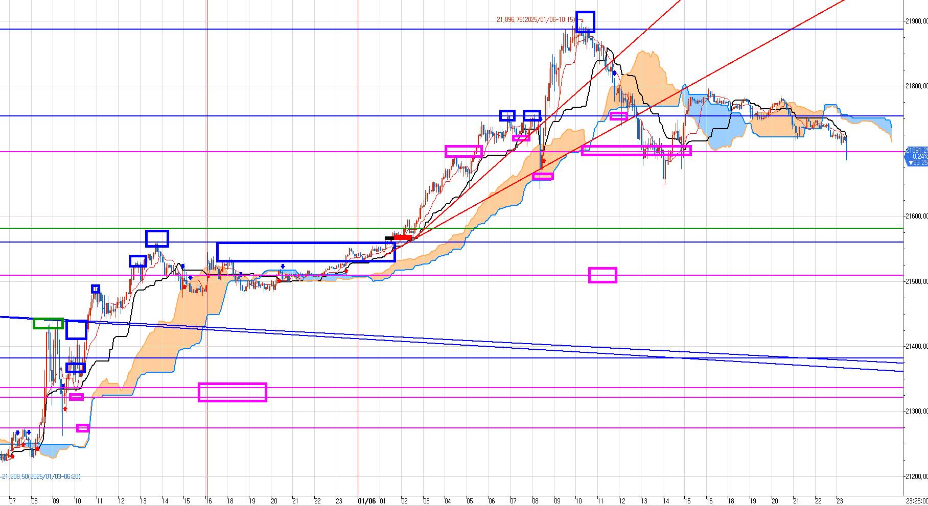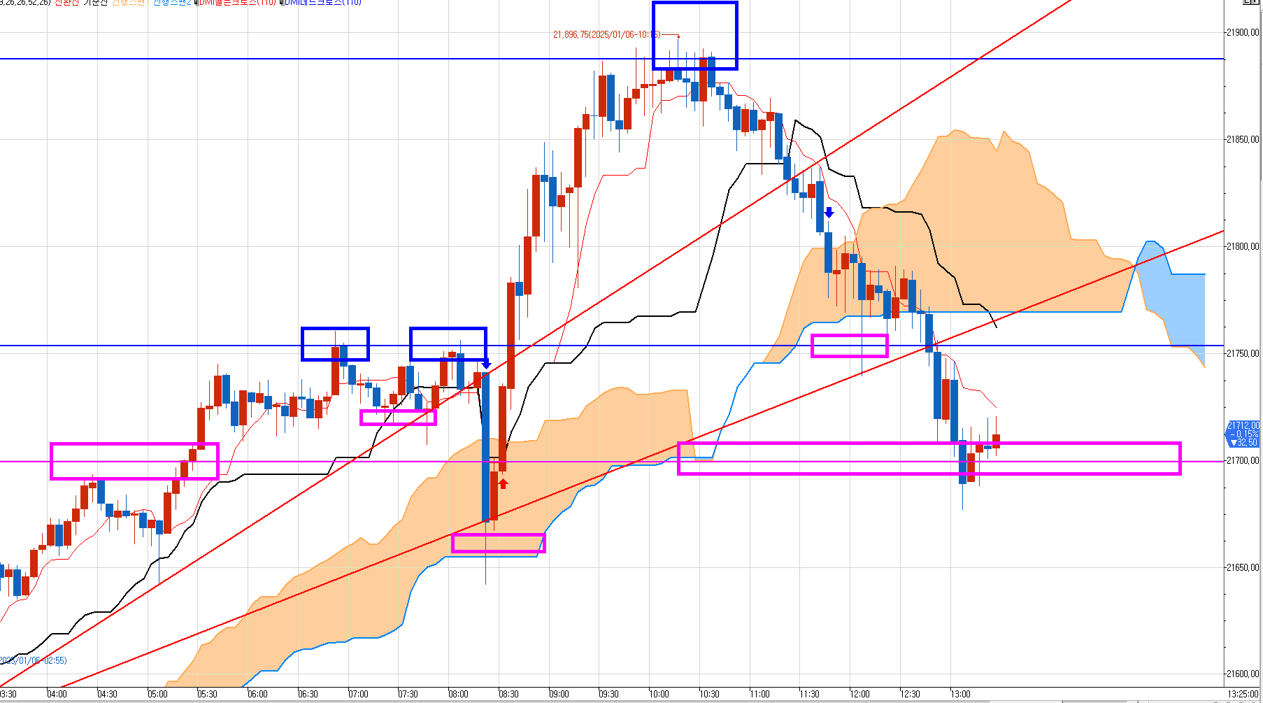좌측 분홍박스 구간에 21700 매수목표가 청산 완료하고 관망!