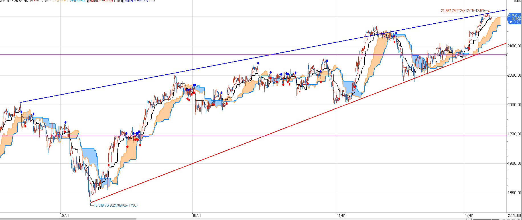 11월 초 나스닥 85분 봉이다. 트럼프 당선 직후 쳐 올라가기 시작했다.