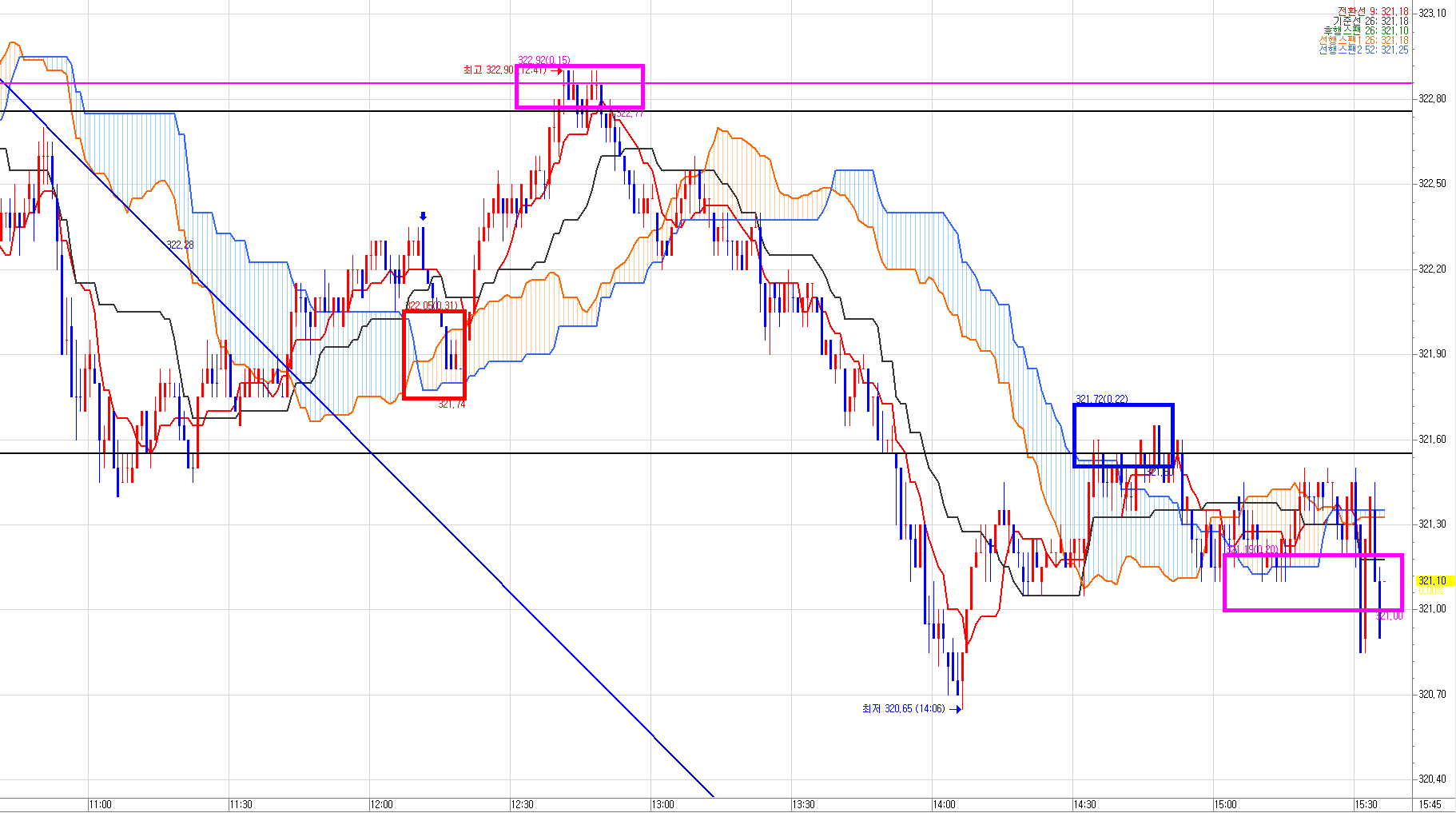 어제 파란박스 구간에서 매도 진입한 선물중 홀딩한 것은 오늘 318에 청산 완료했다.