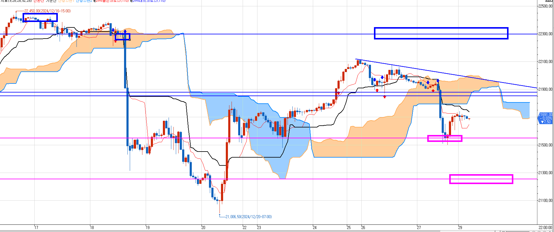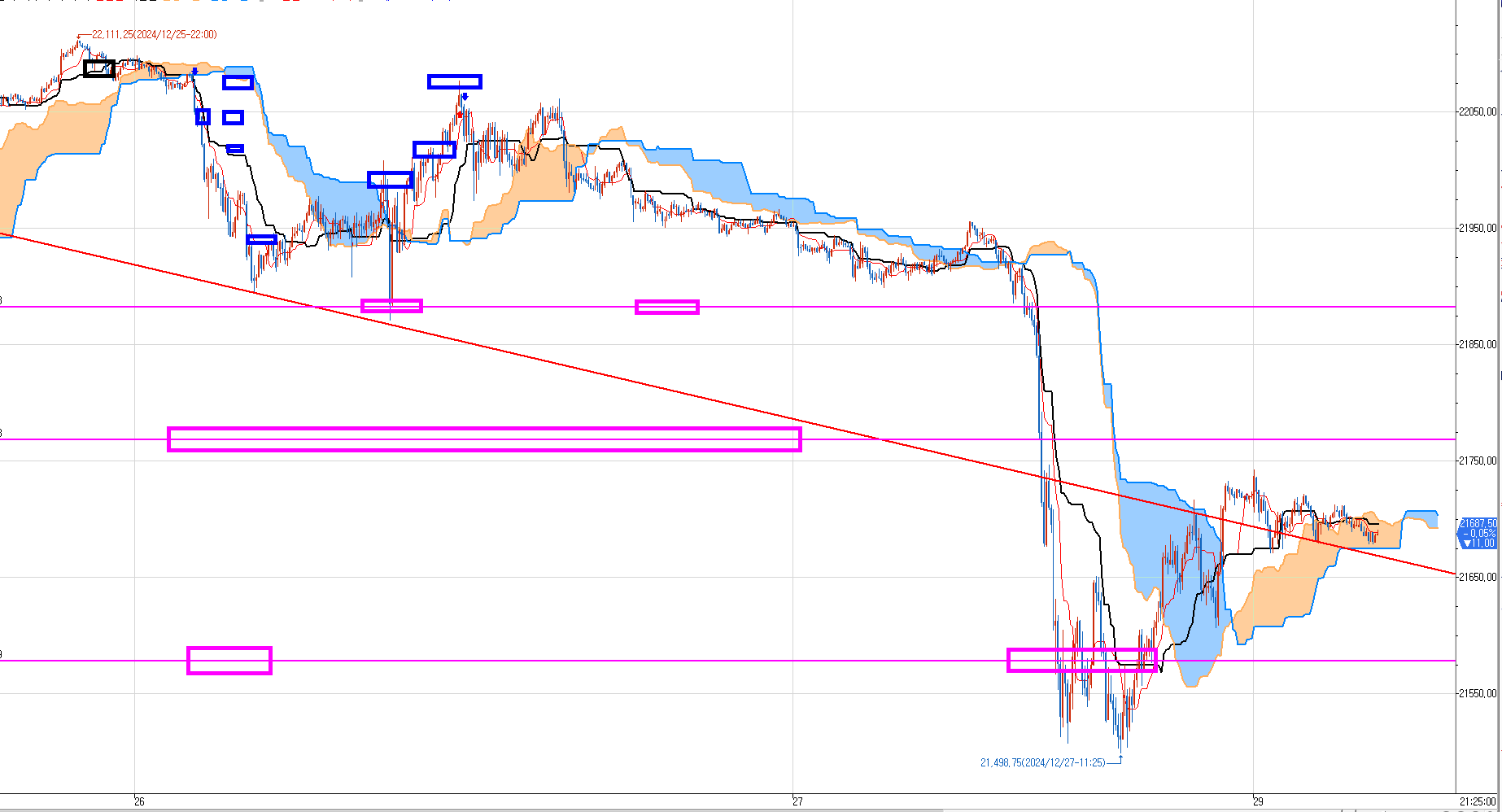 한번 슥~ 내려줄때 첫번째 분홍박스 청산하고, 윗 파란박스 다 매도 잡고 홀딩하고 27일을 맞이했다.
