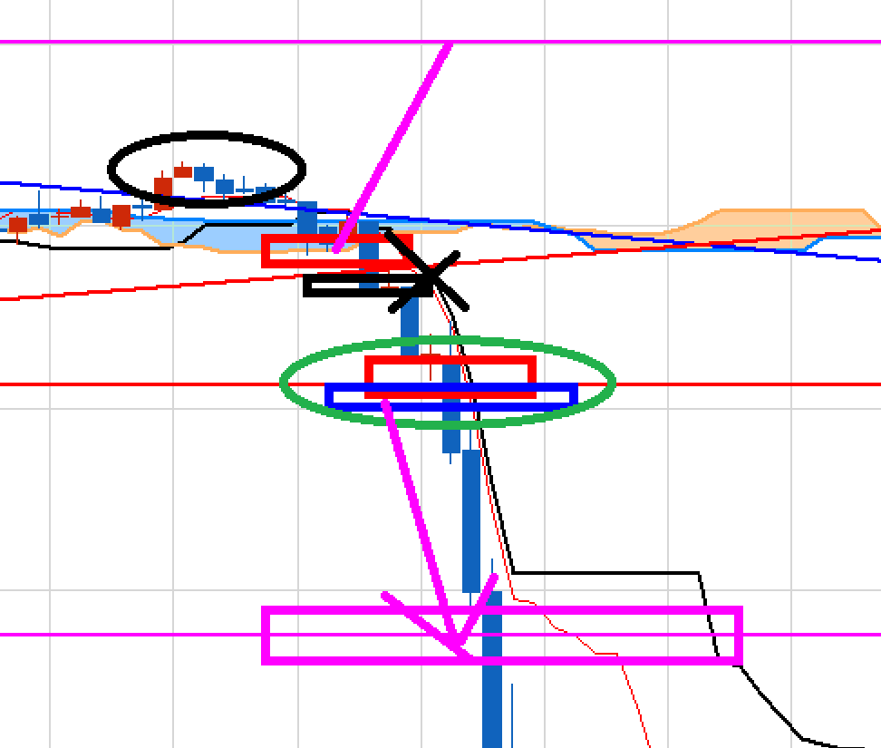 윗 빨간선과 긴 빨간박스는 60분봉과 5분봉의 지지대 였다. 거기서 매수 진입하자 마자 장대 음봉으로 깨버린다. 인정하고 검정색 X 박스에서 손절주었다.