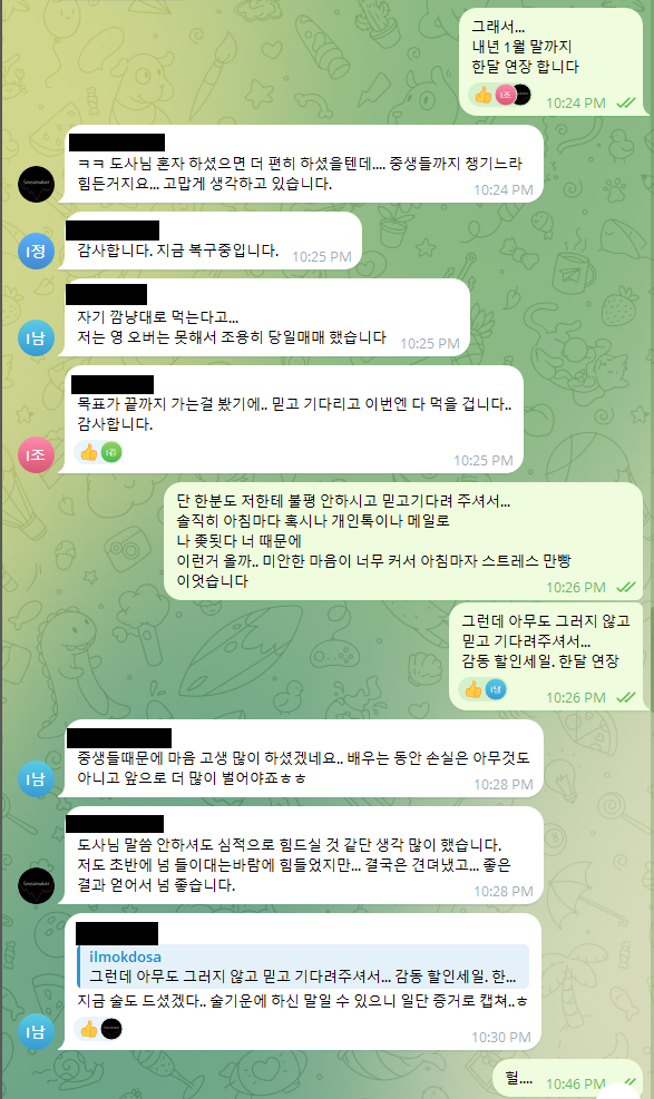 11월15일 밤에 떡락이 나오면서 모두 해피해진 밤의 텔레그램 메세지다.