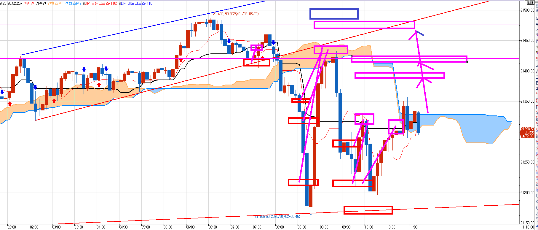 첫 매수 파동 시원하게 먹고 윗 파란박스에서 매도 기다렸는데.. 아쉽게 안줘서 매도는 못 먹었다.