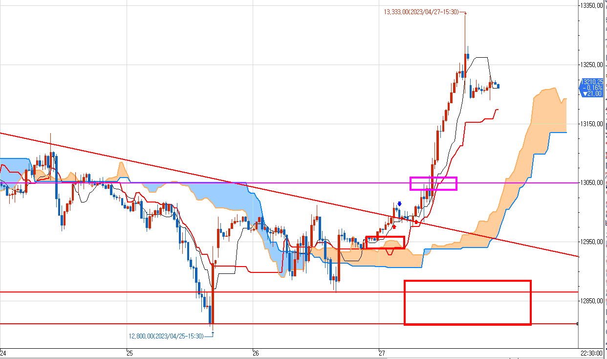 일목균형표 나스닥 30분봉에 매수 목표가가 4월25일에 발생했다.