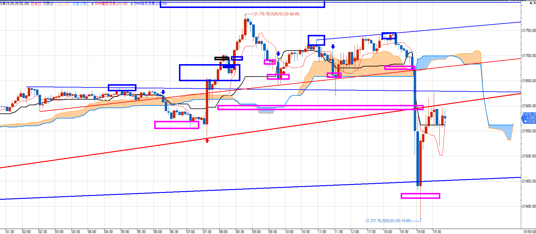 아래 가장 긴 분홍박스 매도 목표가 21596을 어제 저녁에 안쳐서 매도 홀딩한채 잤다.