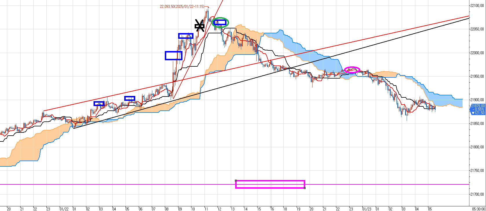 오늘 아침에 보니 5분봉 양운 깨고 하락하고 있었다.
