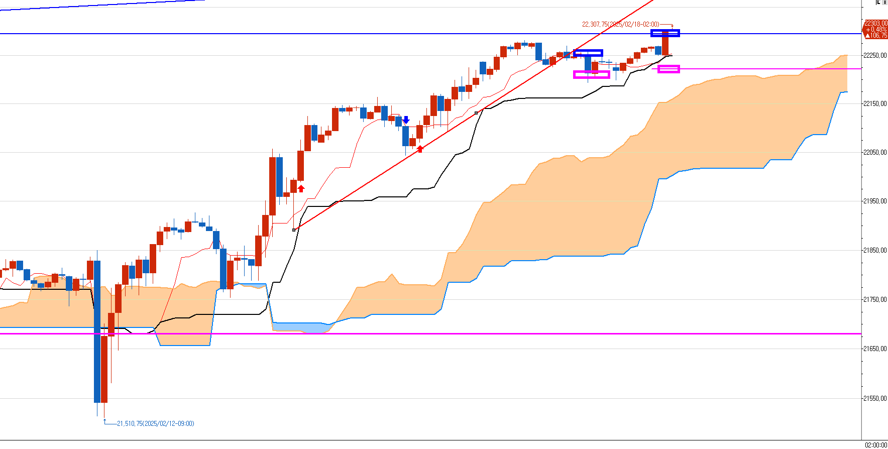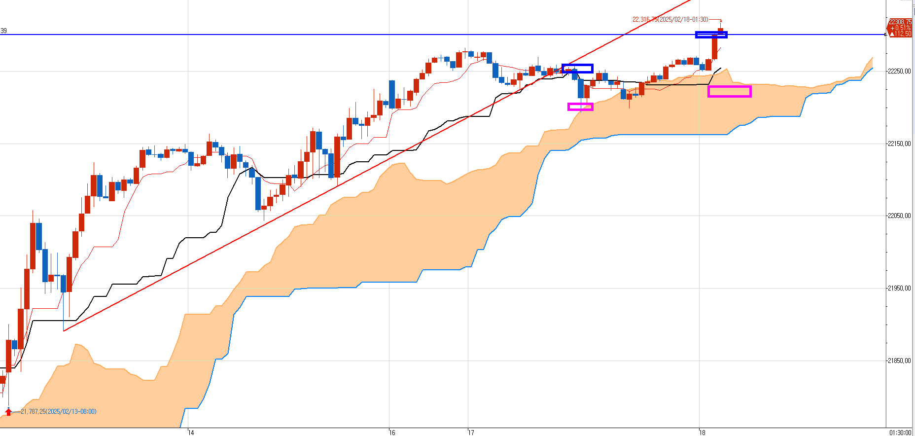 어제 단기 지지선을 깨고 순간 하락이 나왔으나 정확히 일목균형표의 30분 양운을 지지받고 다시 상승 중이다.