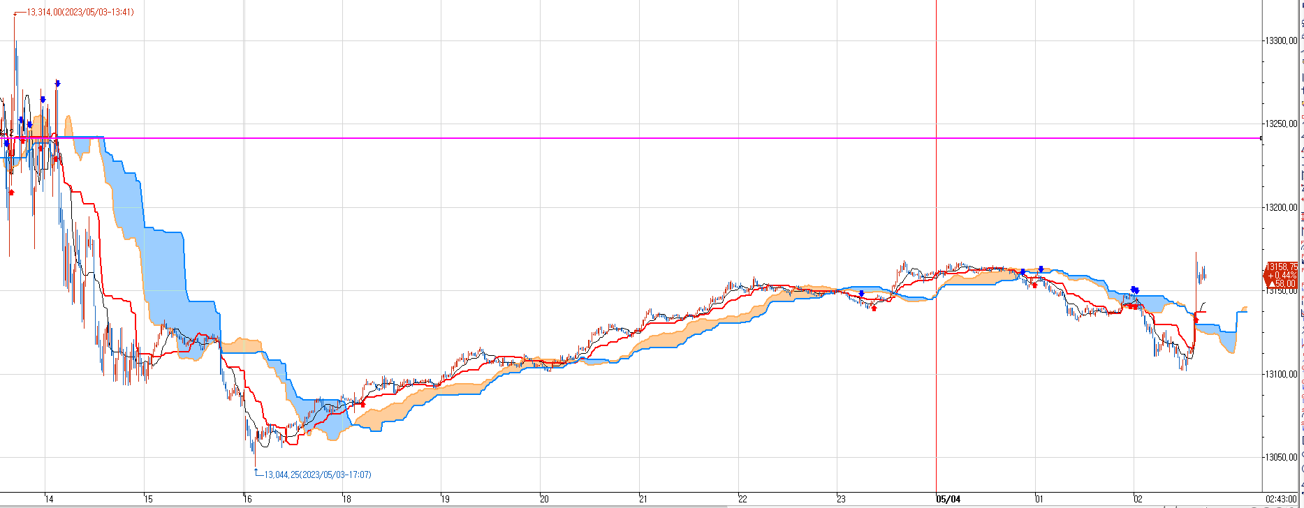 차트를 보면 5월3일 어제는 5분봉이 음운(파란색 구름대) 밑에 있었다.