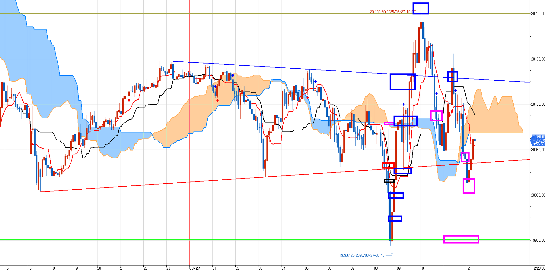 위로 쭉 올라가는데 위 작은 분홍박스 수 목표가를 10틱 덜 치고 다시 밑으로 풍 빠졌다.
