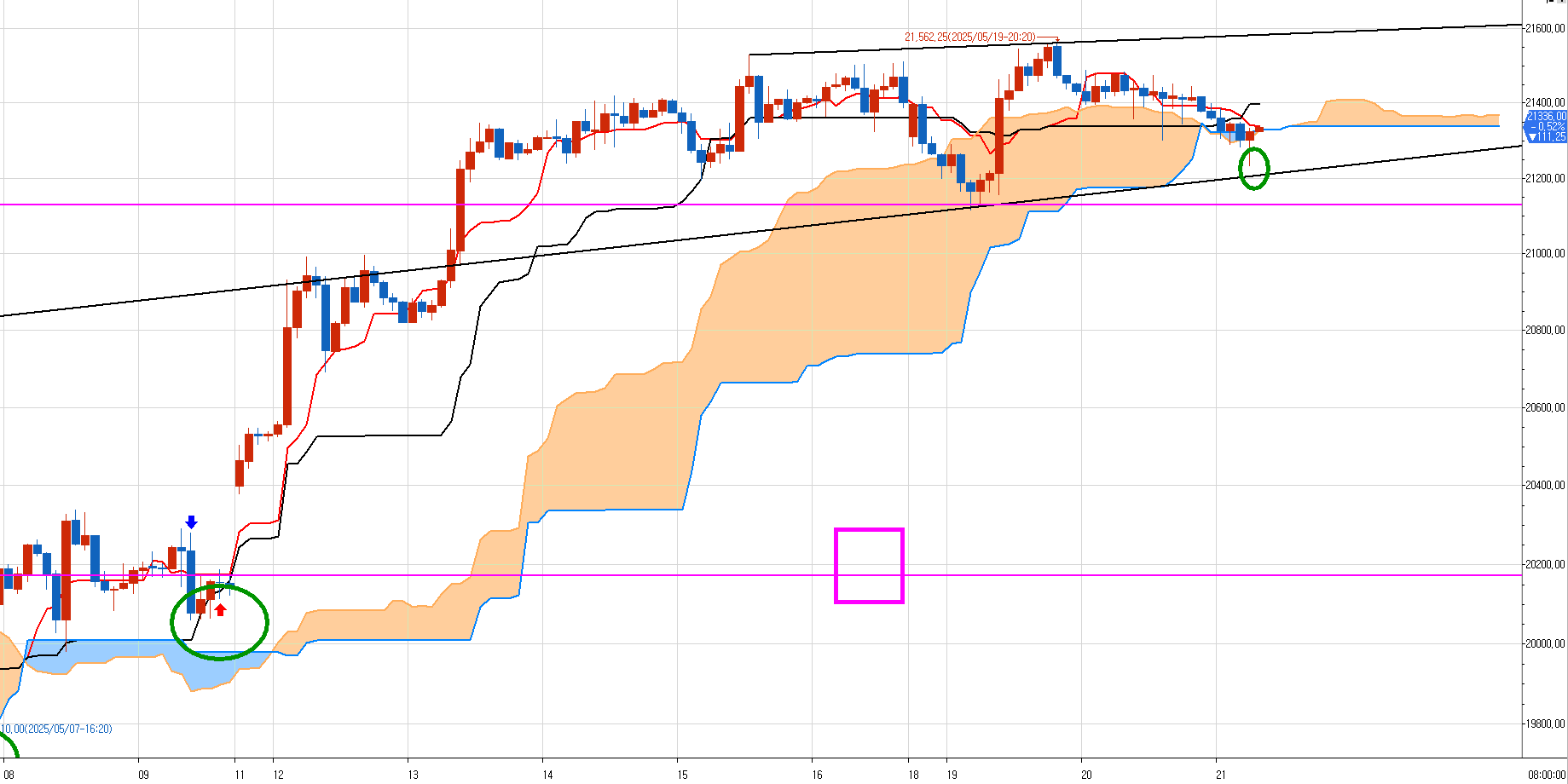 왼쪽 파란박스 3개는 19일 월요일밤에 분할 진입한 매도 구역이다.