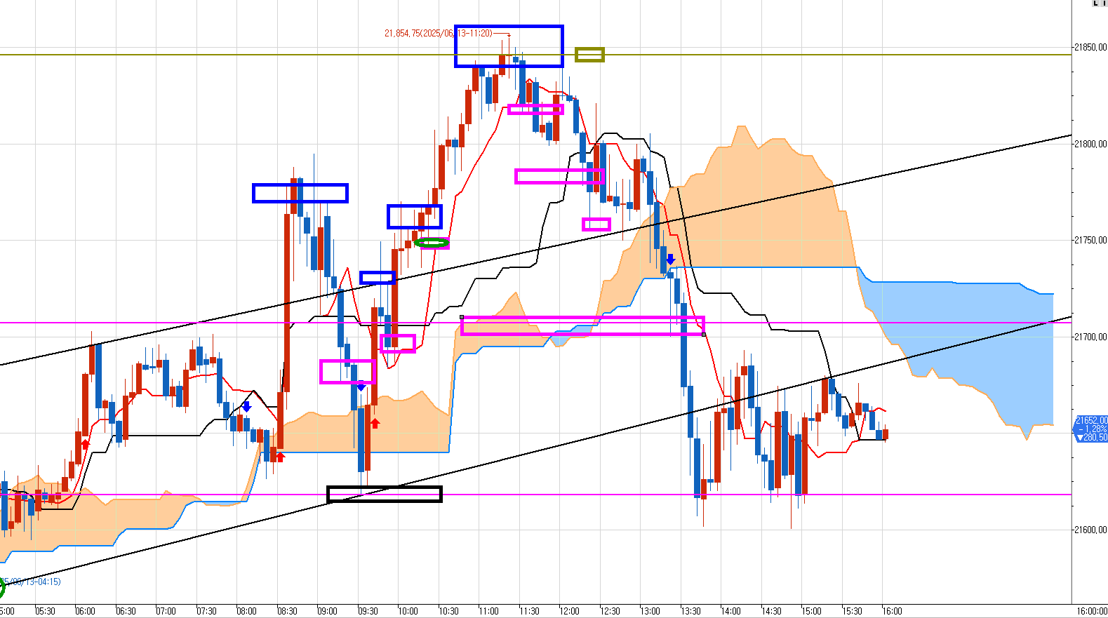 마지막 가장 위 파란 박스에서 매도 진입하여 시원하게 아래 분홍박스 3군데 분할 청산했다.