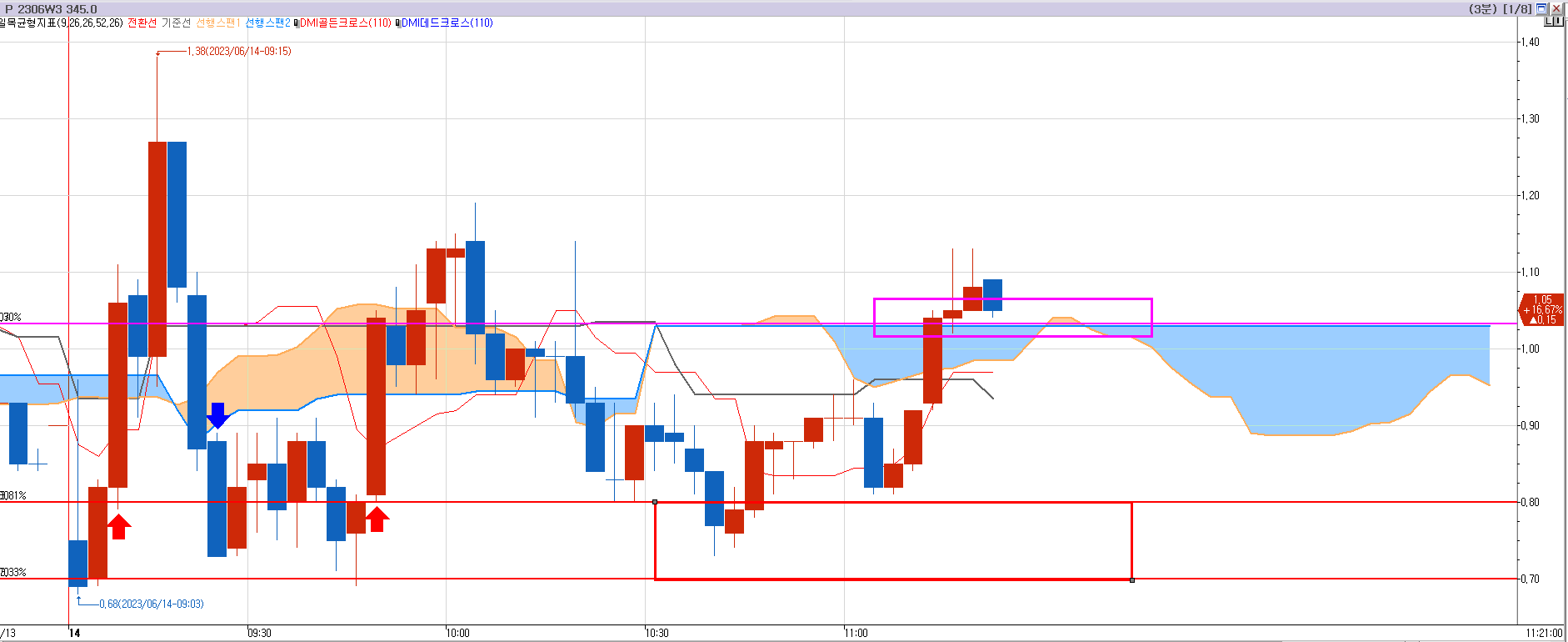 오늘은 차트가 너무 너무 이쁜날이다. 코스피200 선물 1분봉 일목균형표 차트다.