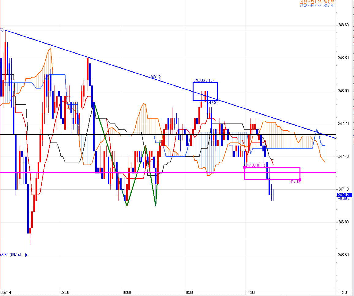 국내선물 140틱 차트에 347.20 매도 목표가가 발생했다.