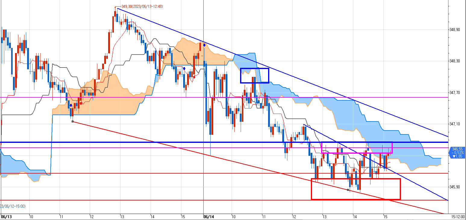 346.75를 빨간봉 세우고 돌파하면 내 최종 목표가인 347.50까지 갈 것이다.