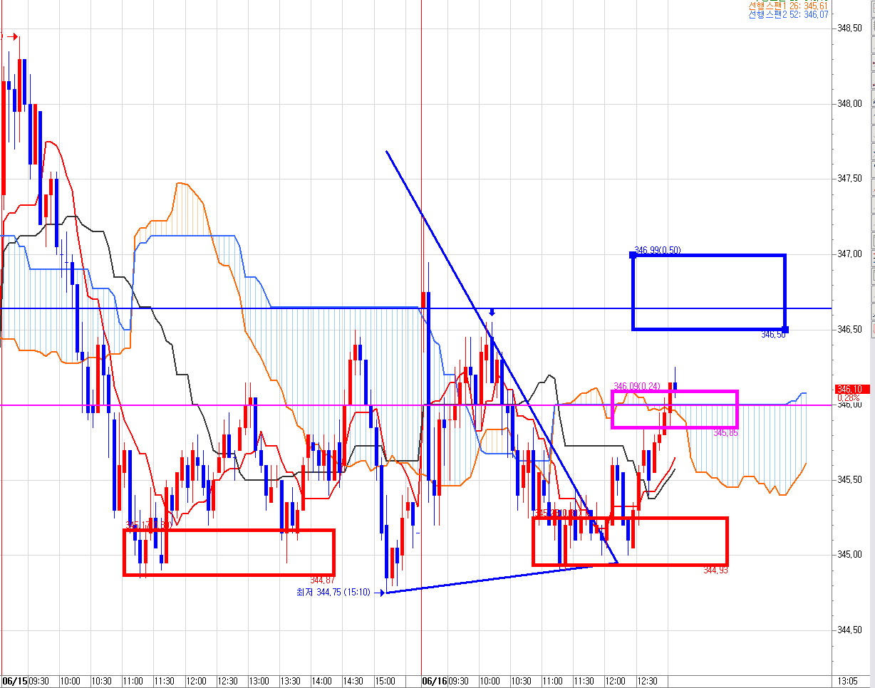 345.30 매도 목표가는 일목균형표 220틱 차트에서 발생했다. 분홍색 박스 구간이다.