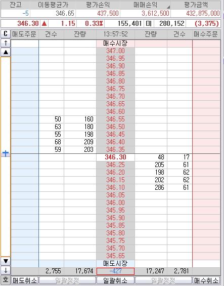 눈치보다 오늘 345.30까지 다시 안 빠질것 같으면 후다닥 던지고 마감해야 것다.