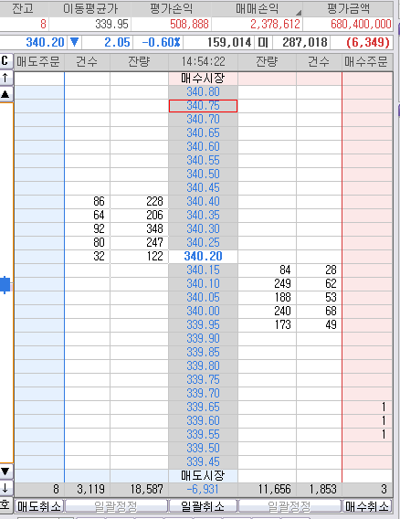 오후장 틱차트에 발생한 340.30에 또 팔아 먹고...(오후장 무한 매수 반복)