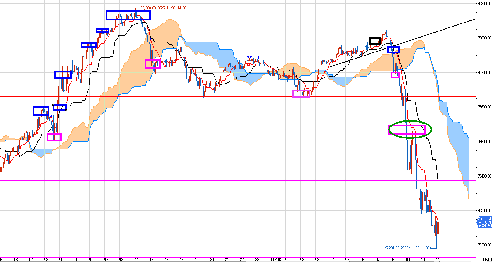 중간에 있는 큰 분홍색 박스(초록색 동그라미)가 수요일에 발생한 매도 목표가 였다.