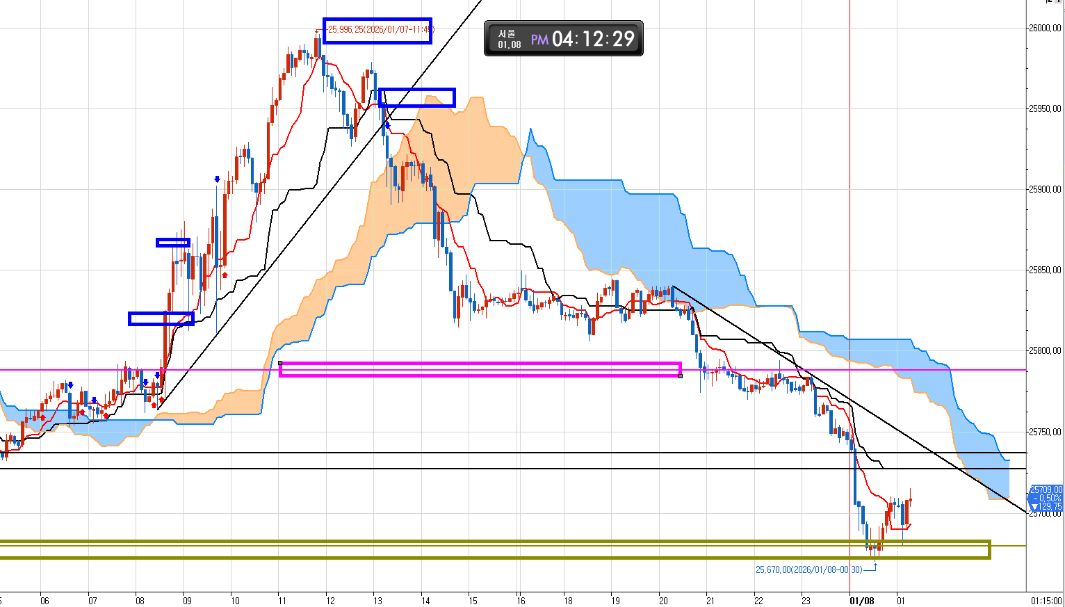 오늘 한국시간 오후4시... 프리장에 매도목표가 25680 (똥색박스)를 찍었다.