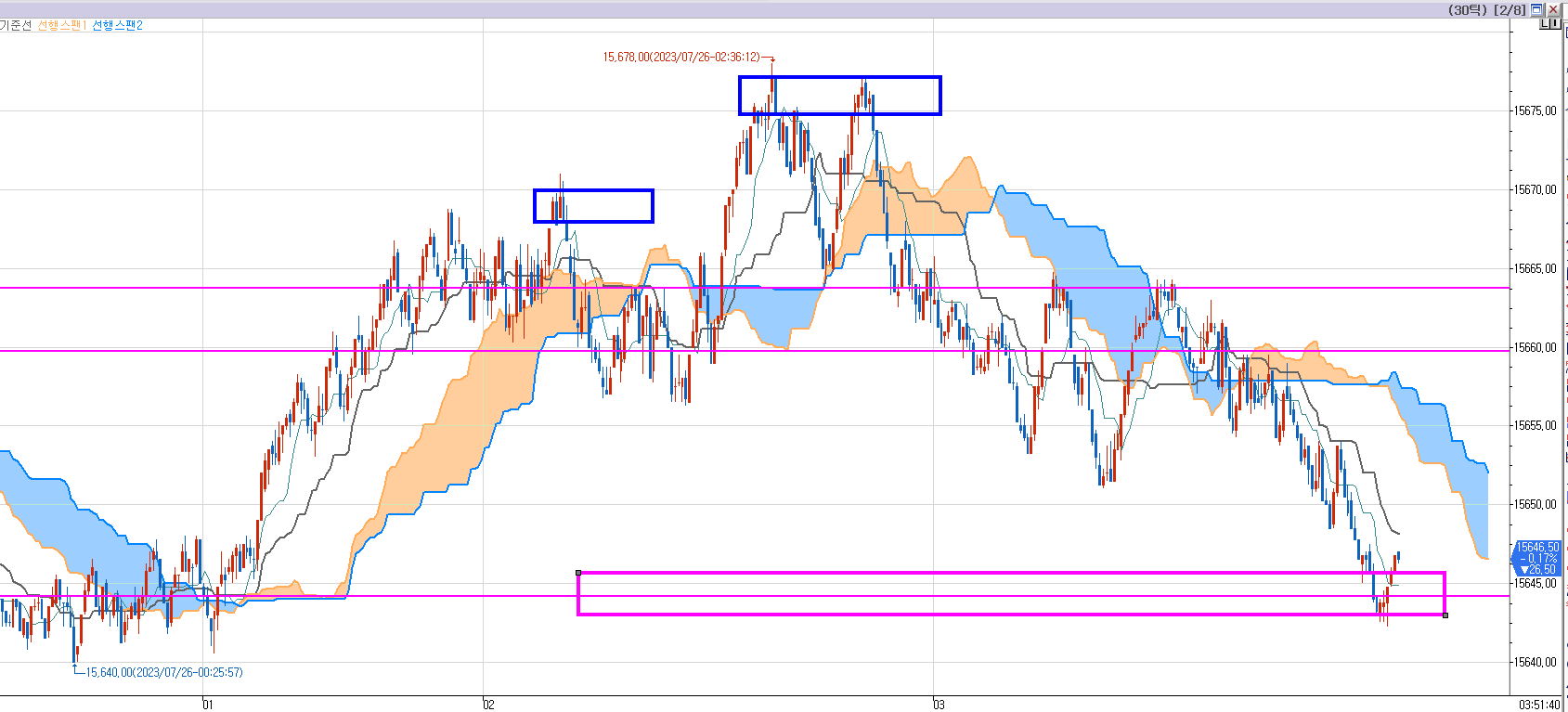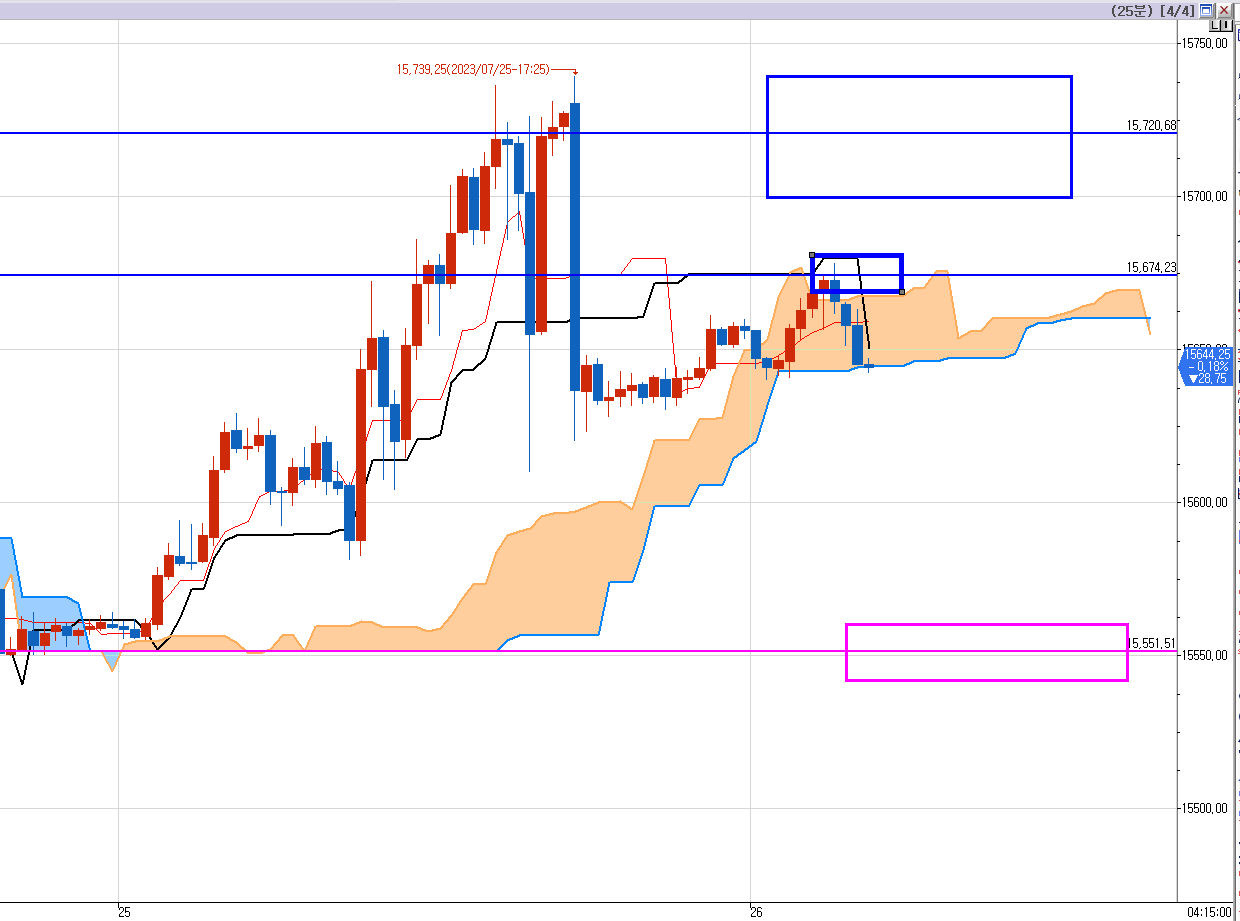 일목균형표 25분봉 상으로는 저~~~ 밑에 15551이 보인다. 분홍색 박스 구간이다.