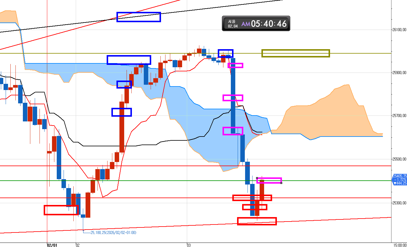 깨진 똥도는 다시 치러 간다! 밑바닥에서 매수 잡은 것은 깨졌던 똥도 25400(초록색선) 부근에 수익 청산하고~