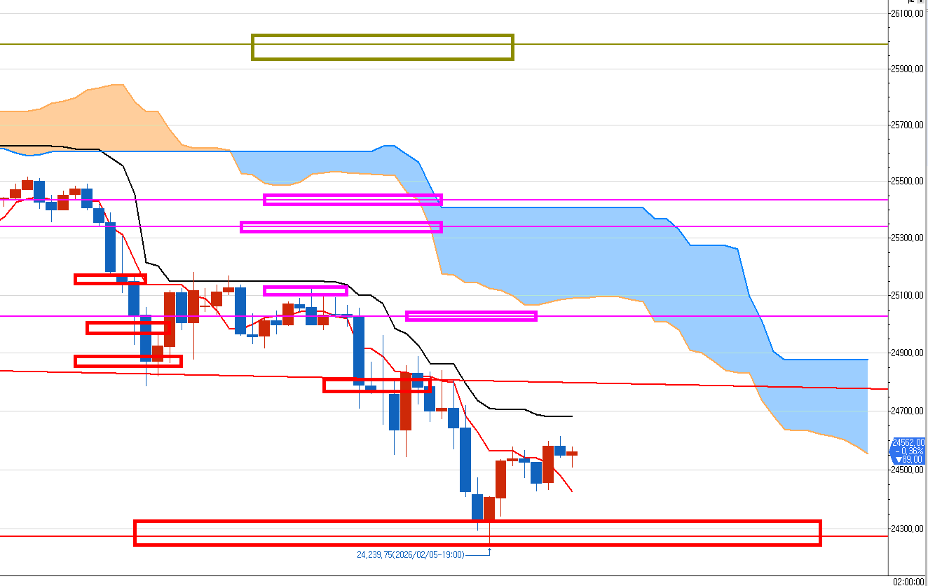 어젯밤 방송에서 언급한 만약 마지막 빨간 지지선 마저 깨지면 24250 부근까지 2000틱이 더 빠질수가 있다.