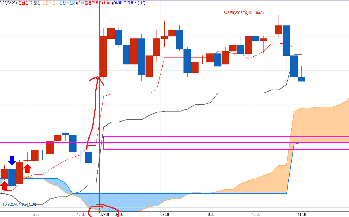 분홍색선이 7월28일 갭상했던 자리다.