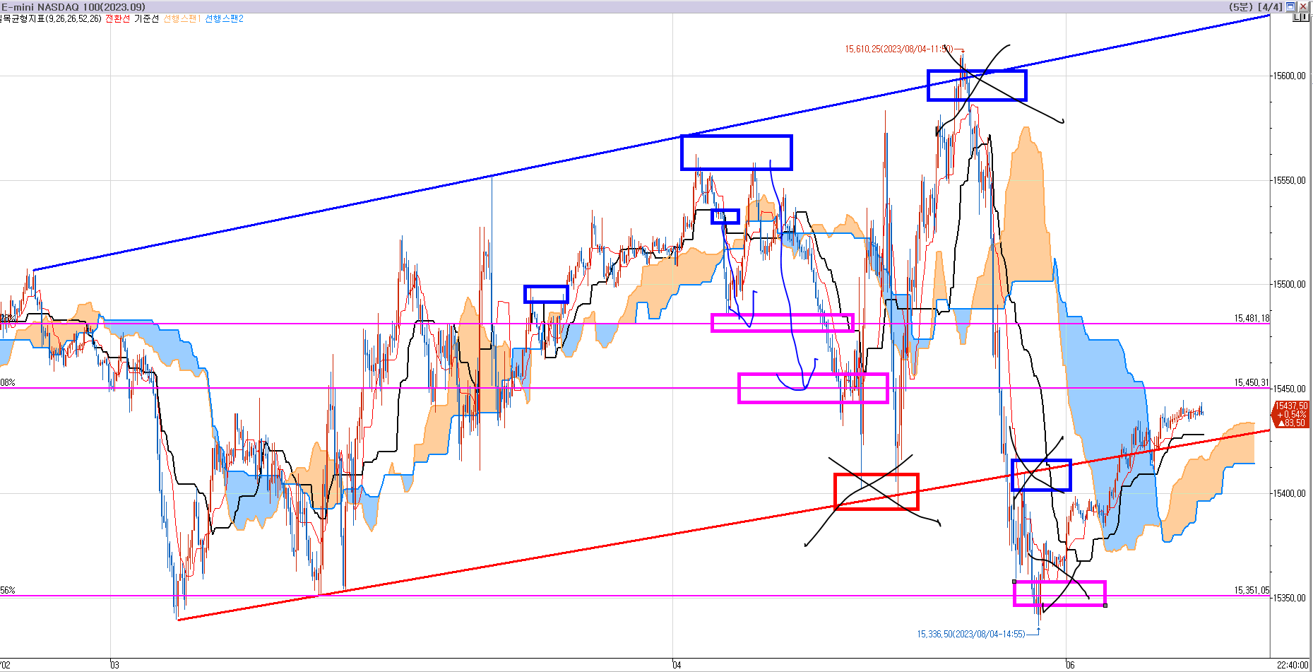 53번 글에서 일목균형표 60틱 차트에서 15450 매도 목표가 발생했고