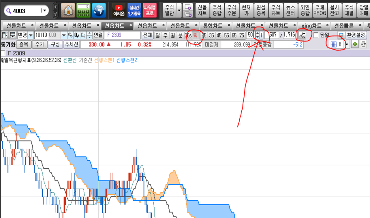 그러나 50틱 차트로 500개 봉까지 밖에 볼 수 없게 설정되어 있어서 X표시한 곳은 일목균형표상의 양운/음운이 제대로 안 나와있다.