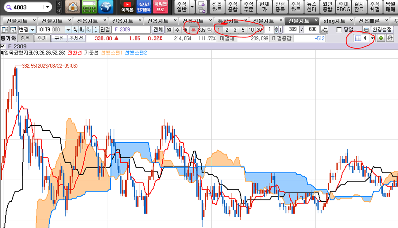 분봉을 일목균형표로 설정한 것이다. 가운데 빨간색 동그라미를 클릭하면 각 분별로 볼 수 있다.
