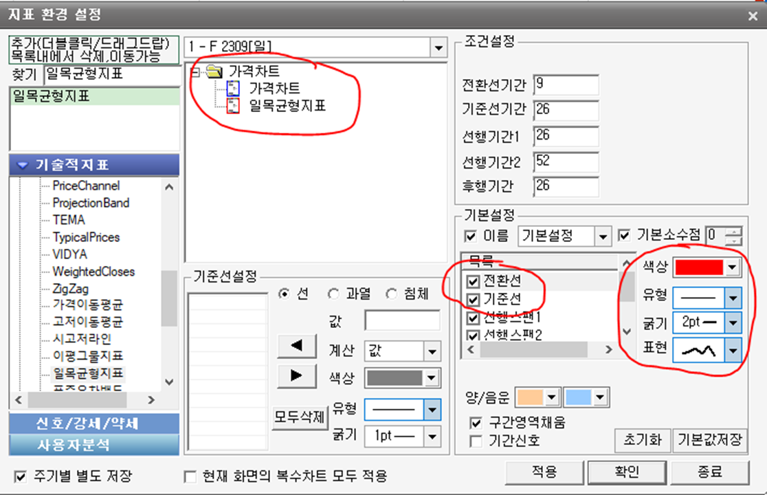 빨간색 동그라미의 일, 주, 월, 분, 틱을 모두 위의 방법으로 일목균형표가 기본 차트가 되게 반복하여 설정해야 한다.