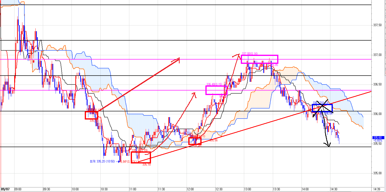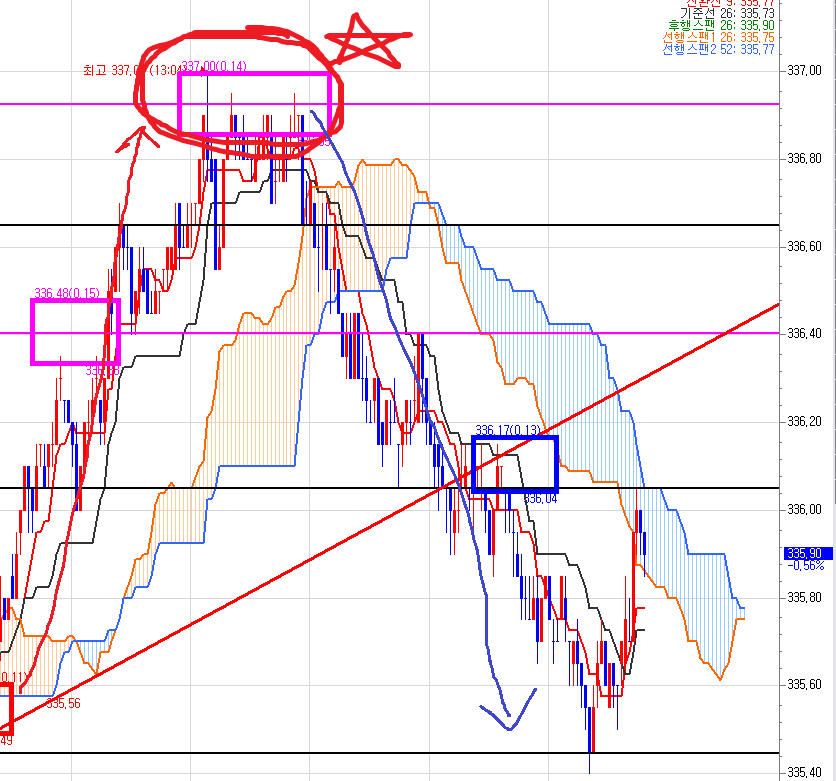 5분봉에서도 20만원짜리 풋옵션이 15만원까지 빠진다고 이미 일목균형표는 오늘 오전부터 알려주고 있었다.