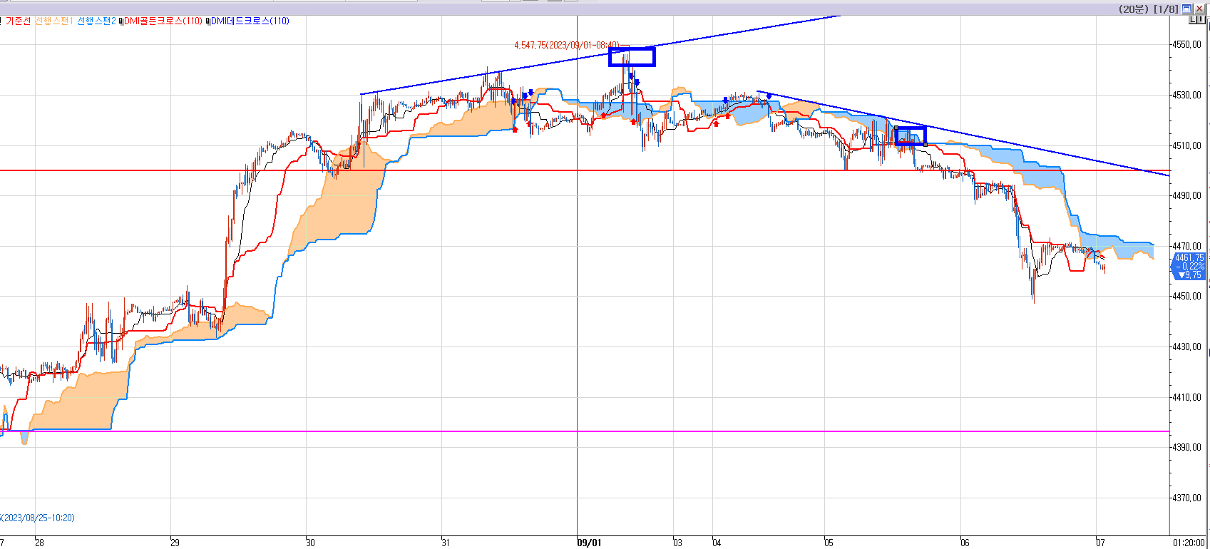 8월말 부터 오늘까지 미선물 20분봉이다.