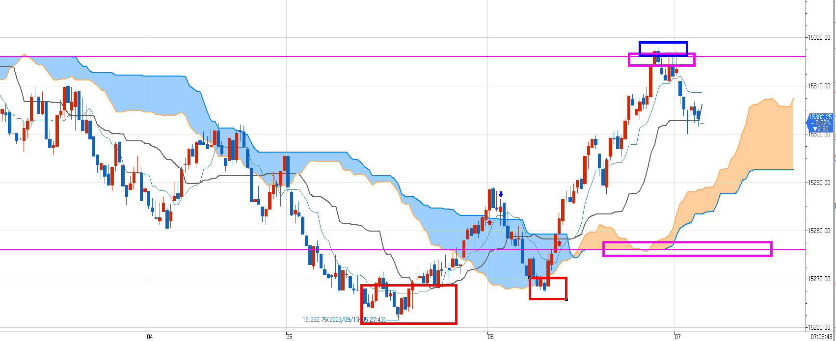 아래 분홍색선은 매도 목표가 15275