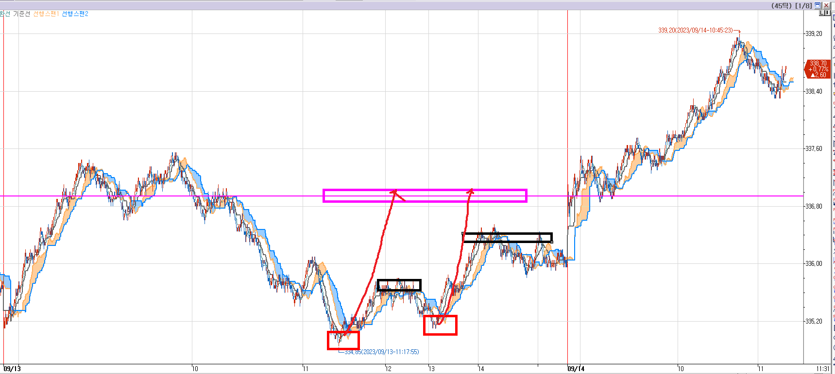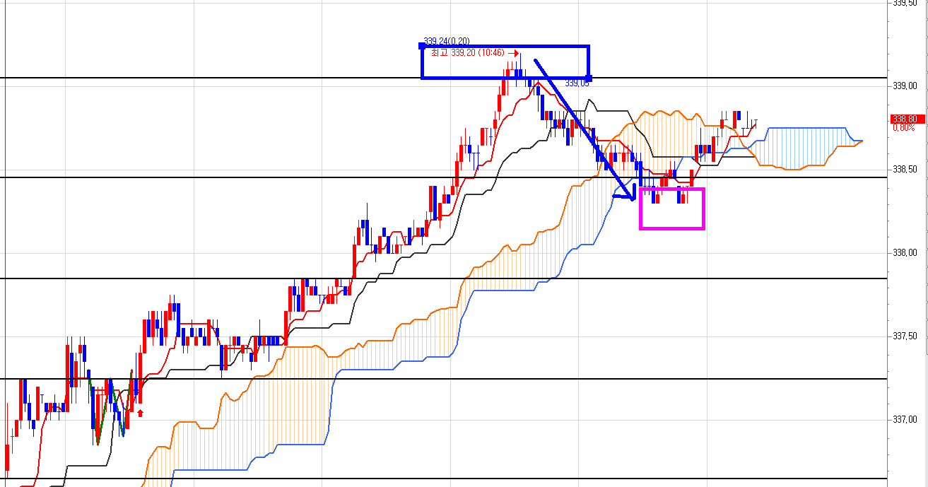 어제 빨간 박스에서 매수 진입하여 수익구간에서 3개 분할 수익하고 2개는 장 막판까지 들고 있어 봤으나 336.90 안갔다.