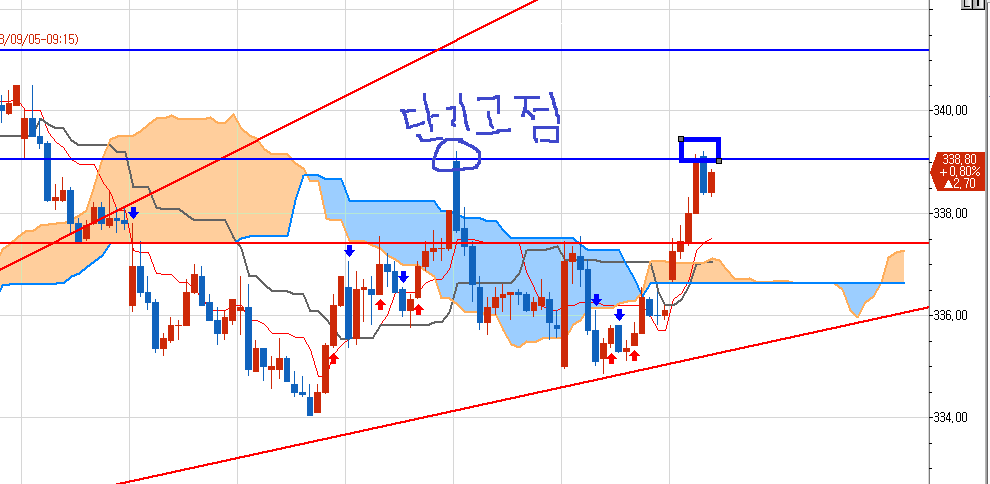 그러나 확인 후 진입하려고 339.20 돌파하나 안 하나 지켜 봤다.