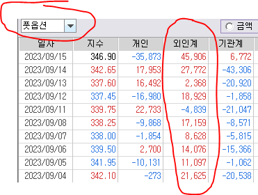 빨간색 동그라미는 외놈들 풋옵션 매수 수량이다.